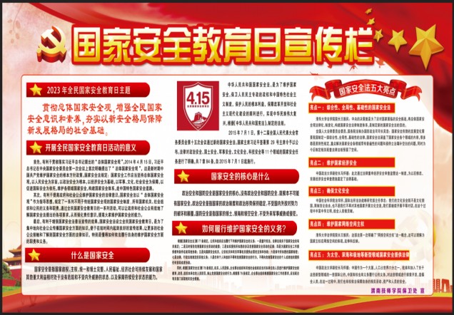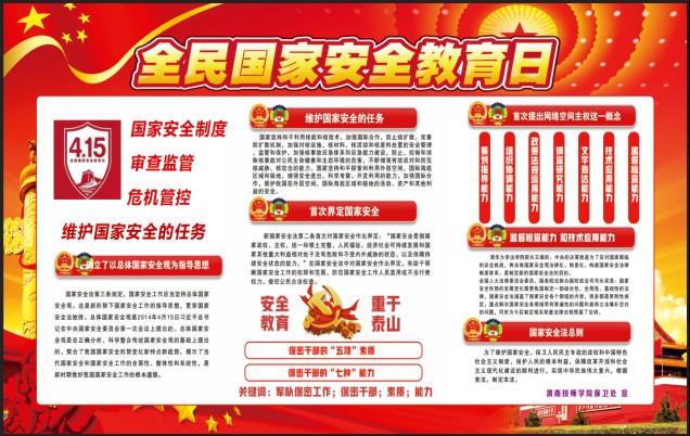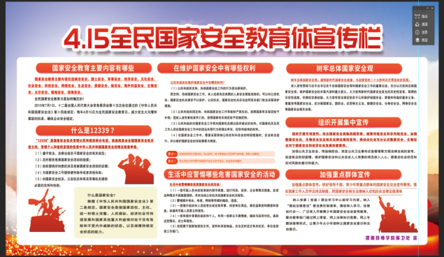 為了讓學(xué)生更直觀的學(xué)習(xí)了解國(guó)家安全知識(shí),保衛(wèi)處制作“4•15全國(guó)全民國(guó)家安全教育”宣傳欄一個(gè),制作宣傳展板四塊,在校園進(jìn)行為期一周的宣傳展覽。