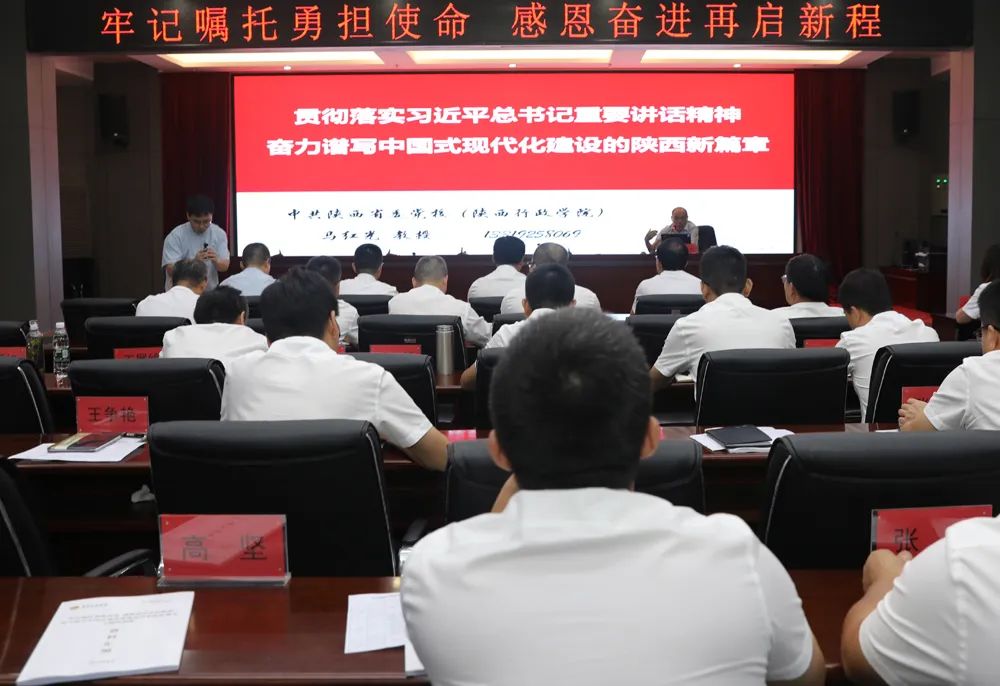陜西省委黨校管理學部馬紅光教授以《貫徹落實習近平總書記重要講話精神,奮力譜寫中國式現(xiàn)代化建設(shè)的陜西新篇章》為題,重點圍繞習近平總書記歷次來陜考察重要講話重要指示,從“科技創(chuàng)新引領(lǐng)經(jīng)濟高質(zhì)量發(fā)展、城鄉(xiāng)區(qū)域協(xié)調(diào)促進共同富裕、綠色低碳轉(zhuǎn)型提升生態(tài)文明水平、擴大開放打造內(nèi)陸改革開放高地、弘揚延安精神夯實高質(zhì)量發(fā)展保障”五個方面進行了專題授課,闡明了陜西在新征程上擔負的使命、秉持的態(tài)度和奮斗的目標,既有理論高度,又有實踐深度,內(nèi)容豐富、深入淺出、系統(tǒng)全面、重點突出,含金量十足。