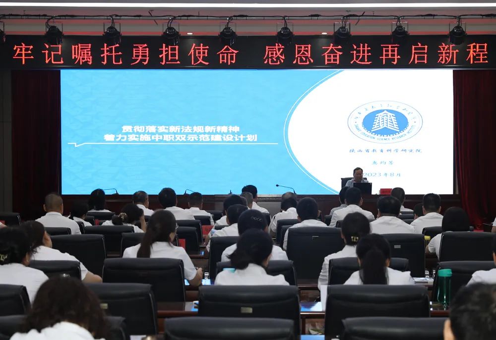 陜西省教育科學研究院職業(yè)教育與繼續(xù)教育研究中心主任惠均芳以《陜西省中職雙示范建設(shè)計劃實施方案解讀》為題,圍繞黨的二十大關(guān)于教育工作的新精神和職業(yè)教育新布局,從“全面貫徹落實新修訂的職業(yè)教育法、準確理解黨的二十大關(guān)于職業(yè)教育新要求、全面把握陜西中職教育發(fā)展機遇與挑戰(zhàn)、著力實施中職雙示范建設(shè)計劃”四個方面進行了專題授課,為學院創(chuàng)建全國“雙優(yōu)校”指明了方向,理清了思路。