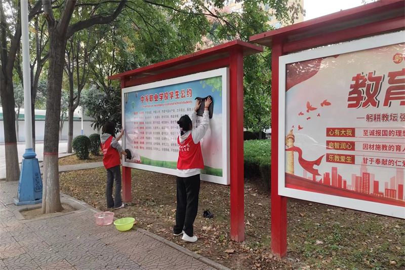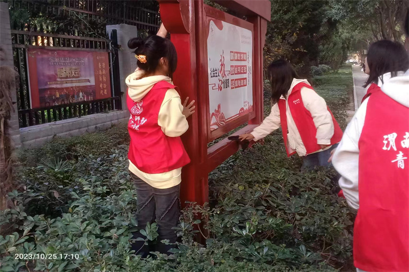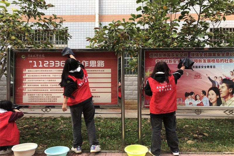 志愿者們分為三組,在各小組隊(duì)長(zhǎng)的帶領(lǐng)下積極得投入到了勞動(dòng)中。一隊(duì)志愿者們對(duì)教學(xué)樓的衛(wèi)生情況進(jìn)行了大檢查,從一樓到七樓依次排查,對(duì)樓梯間、教室外窗臺(tái)、樓道高處窗臺(tái)、樓道、水房等衛(wèi)生死角的垃圾進(jìn)行了徹底清除。二隊(duì)、三隊(duì)的志愿者們對(duì)校門(mén)前廣場(chǎng)、校外東西兩側(cè)宣傳欄、辦公樓前宣傳欄、榮譽(yù)墻進(jìn)行了擦拭保潔,經(jīng)過(guò)志愿者們的辛勤付出,各宣傳欄煥然一新。
