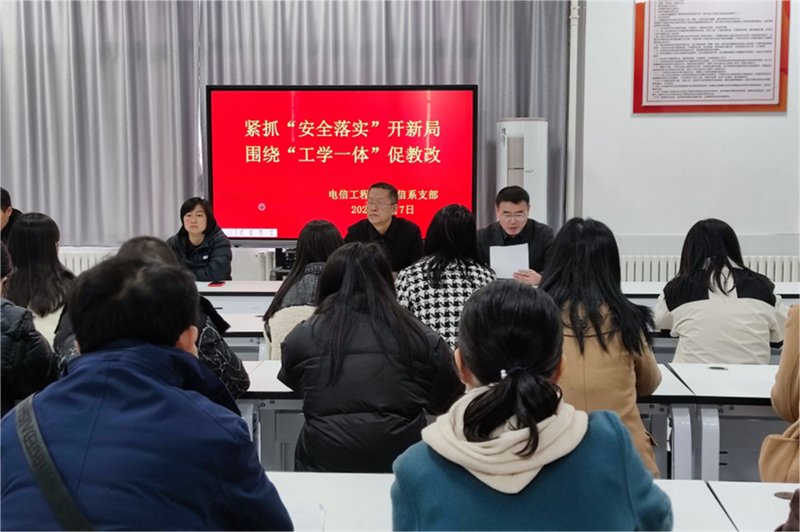緊抓“安全落實(shí)”開新局 圍繞“工學(xué)一體”促教改——電信工程系召開新學(xué)期教學(xué)管理工作會。 2024年3月7日下午,電信工程系在產(chǎn)教融合4樓討論室召開新學(xué)期教學(xué)管理工作會。會議由教學(xué)管理科副科長王爭艷主持,電信工程系負(fù)責(zé)人馬建紅、電子商務(wù)教研組長王文濤、計(jì)算機(jī)教研組長楊永剛、電信工程系全體專業(yè)課教師、教學(xué)管理人員,及全體黨員教師參會。