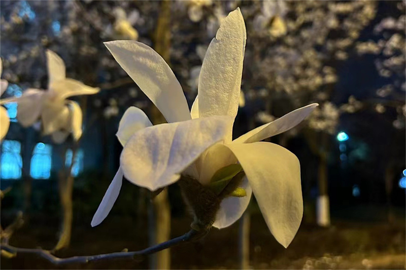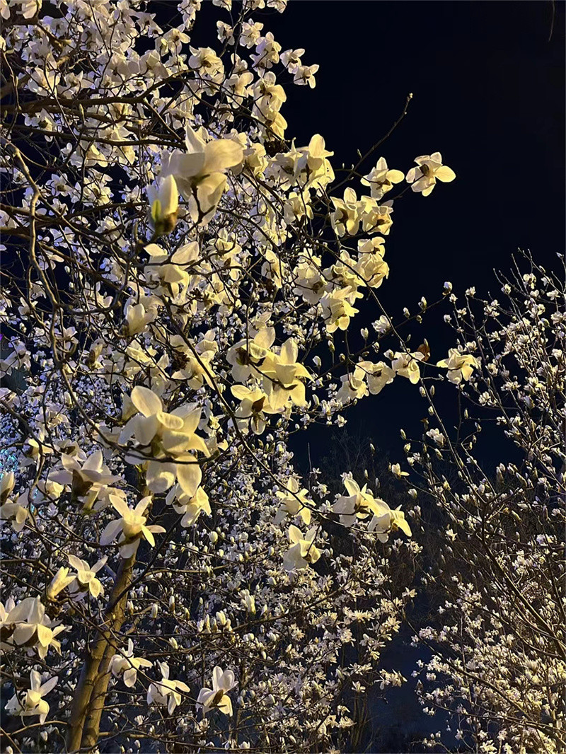 陽光透過樹葉的縫隙 灑在校園的每一個角落 玉蘭、春梅、櫻花 你不讓我、我不讓你 競相綻放 這些美麗的精靈 邂逅藏在校園里的春色
