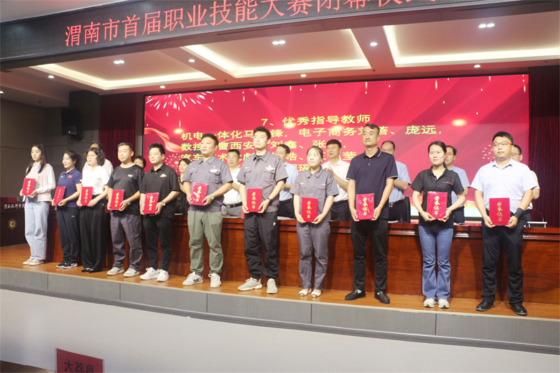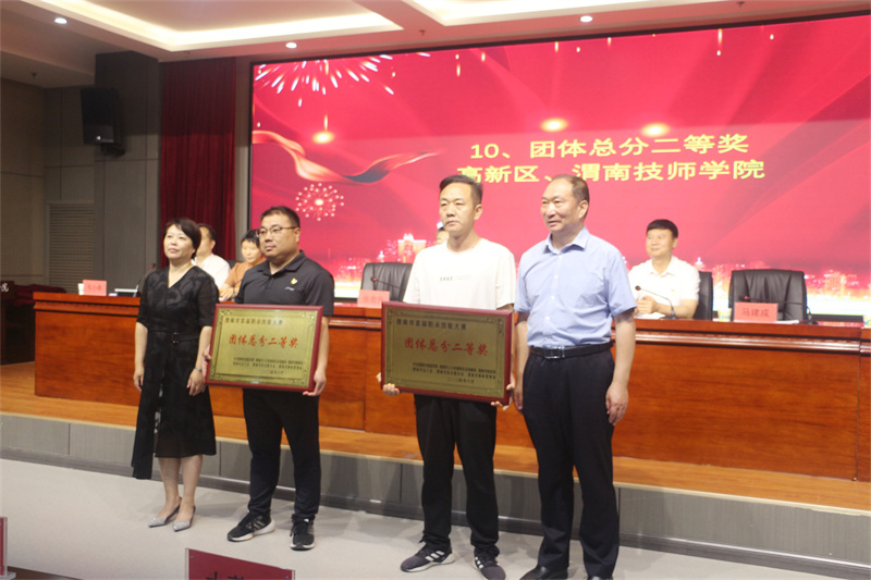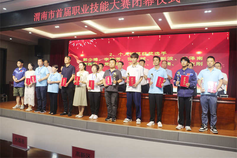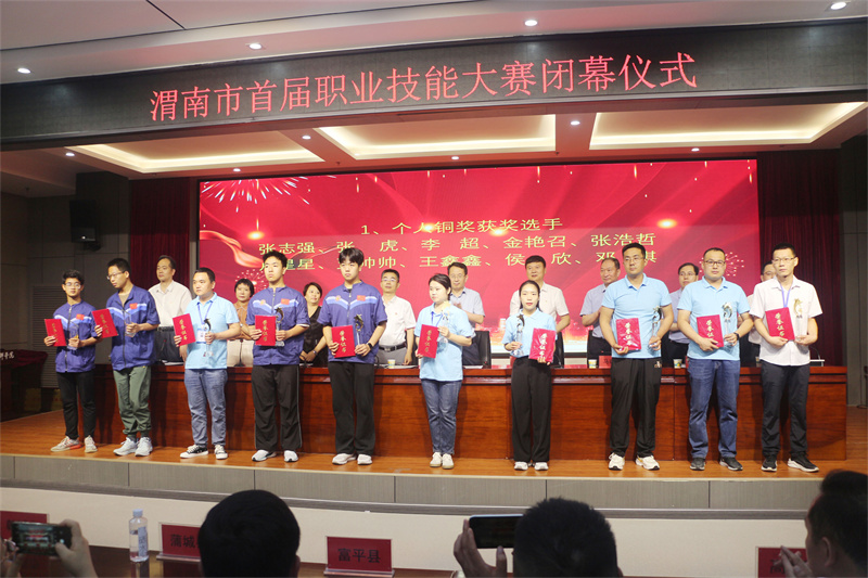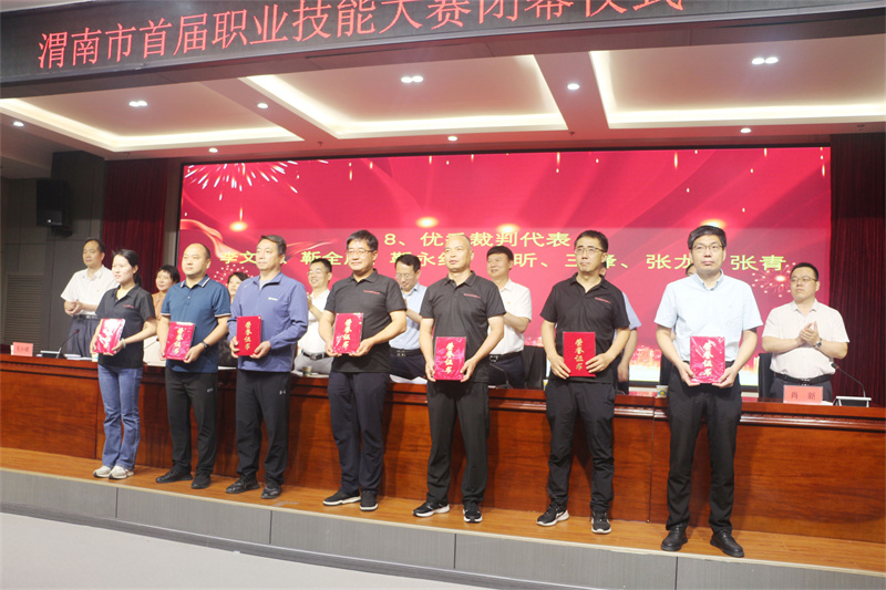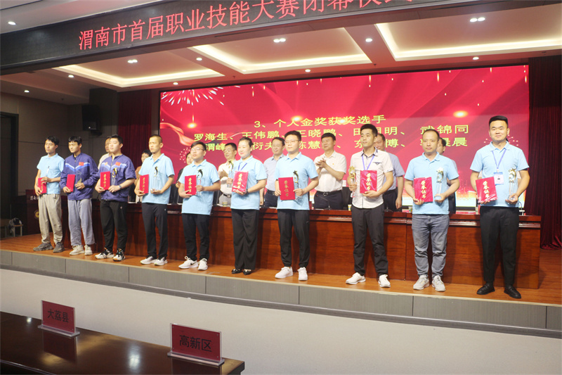 渭南技師學(xué)院黨委書記曲志勇宣讀了《關(guān)于公布渭南市首屆職業(yè)技能大賽比賽結(jié)果的通知》;毛小建做了賽事點評;周慶華宣讀了前三名獲獎選手名單;郭紅印宣讀了優(yōu)秀指導(dǎo)教師、優(yōu)秀裁判名單;馬麗宣讀了優(yōu)勝獎獲獎名單;肖新宣讀了團體總分獲獎單位名單。