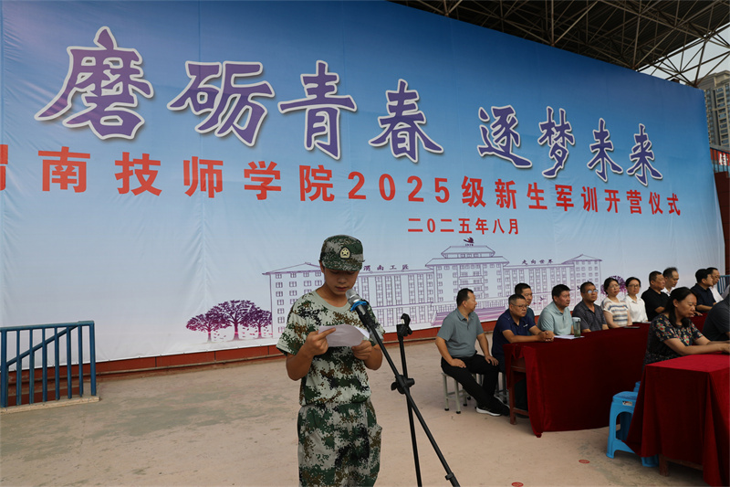 學生處處長、軍訓團團長李峰宣讀《渭南技師學院2025級新生軍訓實施方案》。軍訓教官代表任二楊與新生代表陜職汽車2501班任軒弘分別作表態(tài)發(fā)言。