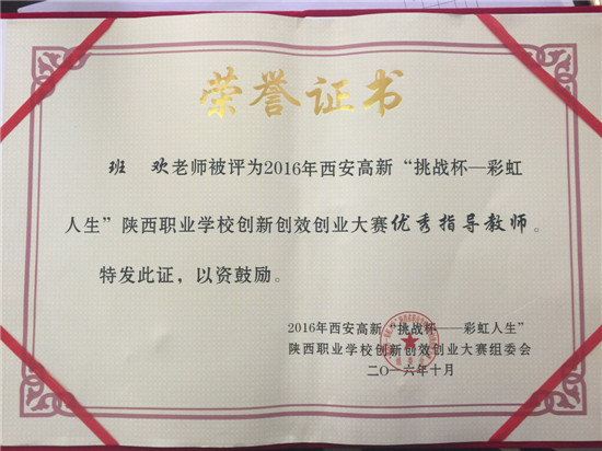 由共青團陜西省委、省高教工委、省教育廳、省科技廳、省科學院、省社科院、省學聯(lián)、西安高新區(qū)管委會共同主辦的“挑戰(zhàn)杯—彩虹人生”陜西省職業(yè)學校創(chuàng)新創(chuàng)效創(chuàng)業(yè)大賽活動中我院李峰老師、班歡老師分別榮獲陜西省優(yōu)秀指導教師。