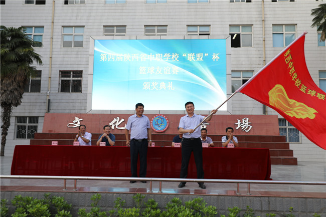 閉幕式上,曲志勇院長從陜西省電子信息學(xué)校校長顧學(xué)福手中接過陜西中職學(xué);@球聯(lián)賽會旗,我院將承擔(dān)第五屆籃球聯(lián)賽。