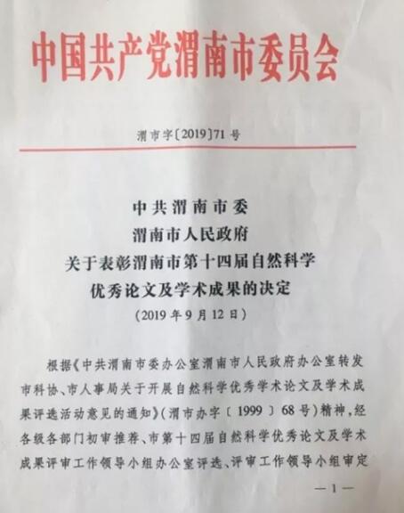 在袓國70華誕來臨之際,由我院薛冬老師主持,楊亞楠、李鉞、王敏等老師參與研究的省級規(guī)劃課題《中等職業(yè)教育質量提升案例研究》成果,被市委、市政府授予“渭南市第十四屆自然科學優(yōu)秀論文及學術成果”二等獎。
