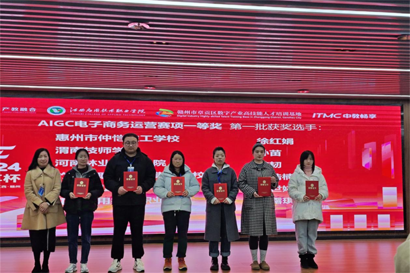 由中國商業(yè)聯(lián)合會(huì)主辦、中國商業(yè)聯(lián)合會(huì)互聯(lián)網(wǎng)應(yīng)用工作委員會(huì)等單位承辦的2024年“暢享杯”全國數(shù)字商業(yè)技能大賽電子商務(wù)師-AIGC電子商務(wù)運(yùn)營總決賽于12月17日-19日在江西省贛州市章貢區(qū)數(shù)字產(chǎn)業(yè)高技能人才培訓(xùn)基地進(jìn)行。來自全國17個(gè)省市的81個(gè)中高職院校的教師隊(duì)伍參賽。經(jīng)過激烈角逐,我院電信工程系專業(yè)課教師孫苗、楊雪經(jīng)過預(yù)賽闖入全國總決賽,分別榮獲一等獎(jiǎng)、二等獎(jiǎng)。